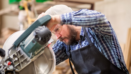 Carpentry - a man woodworker cutting the wood with a circular saw