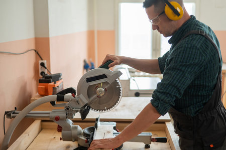 Carpenter wearing safety glasses and ear protection operating an electric saw while cutting a piece of wood in his workshop