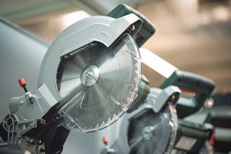 Circular saw close up in a carpentry workshop.Equipment and tools in a carpentry workshop.Profession, carpentry, woodwork and people concept