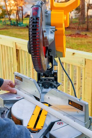 industrial sliding compound mitre saw used for cutting pvc, plastic and metal at production factory