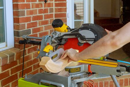 Hands of a handyman sawing door frame detail of the required length using miter saw.