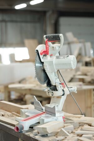 Modern powerful circular saw placed on desk among wooden pieces in carpentry workshop
