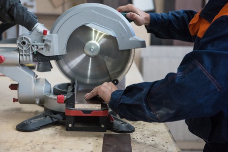 worker cuts board on circular saws man cutting shoe Moulding on electric saw