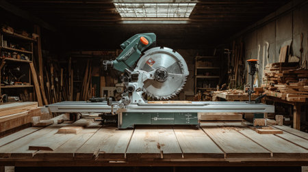 This image showcases a precision miter saw placed on a rustic workbench in a well-equipped woodworking shop, surrounded by various lumber pieces and tools for craftsmanship.