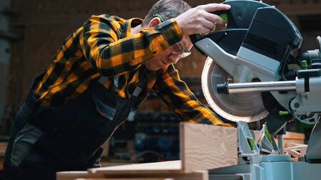 Caucasian man carpenter worker working driving circular saw to cut boards