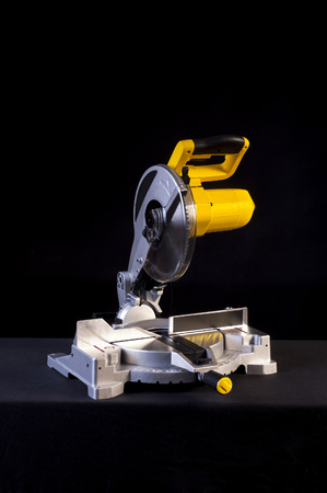 miter saw with yellow body, photo taken on a sunny summer day