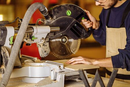 Man, worker sawing wood with a circular saw, machine for wood cutting. The manufacture of furniture. Furniture accessories. Machine for cutting MDF, particle Board.