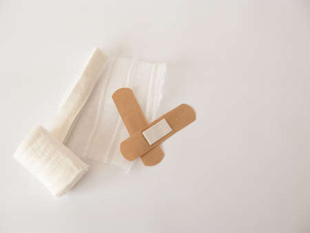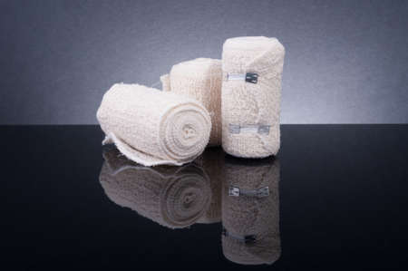 Bandage used for injuries during work, leisure time or in housework, isolated on glossy black background