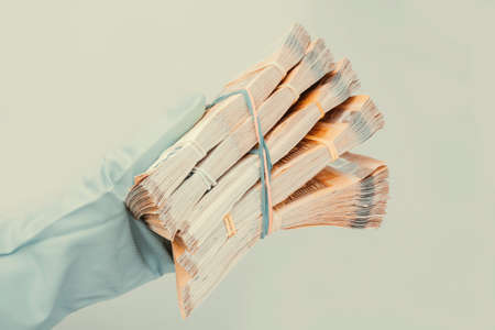 Hand projected with rubber glove holding, receiving or giving wad of European union Euro money cash banknotes, prevention virus spread, world money concept Corona virus COVID-19 outbreak. Creative toned