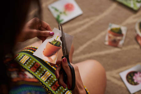 top view of the hands of a woman making a selection of a collection of pictures on a selection process of images on a desk after a photoshoot - focus on the center of the image