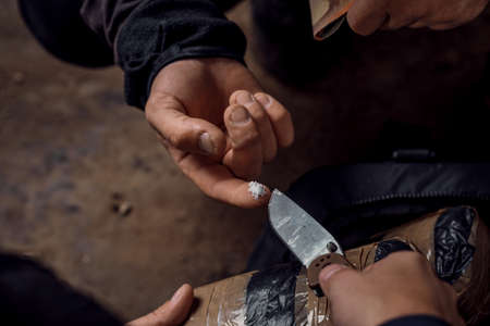 A person with money buys a dose of cocaine or heroin or other drug from a drug dealer.