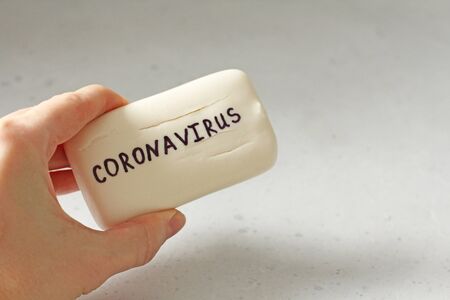 Hand holds bar of soap on which word coronavirus is written. White soap lies in female hand. Hygiene, for prevention of coronavirus, viruses, to stop spread coronavirus covid 2019. Hand washing.