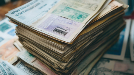 A captivating assortment of vintage currency notes stacked neatly, showcasing the intricate designs and historical significance of financial documents through time.