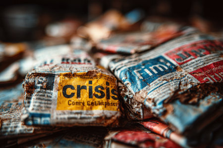 Close-up of word CRISIS printed on dirty, crumpled newspapers. Concept of media panic, economic collapse and urgent news