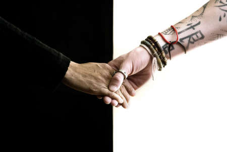 Black and white image of the joined hands of two young men of different ethnicity smiling at each other in front of a blurred wall with the slogan