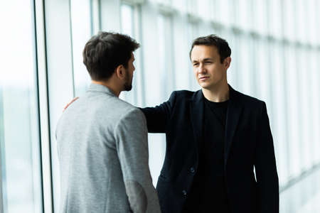 Two business partners dressed in casual wear shaking hands as they signed a contract after important meeting in office. Manager congratulating employee with a successful product release