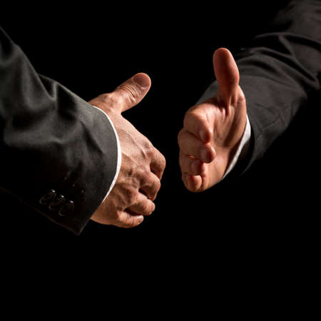 Businessmen in suits reach out to each other for handshake, help, deal, Finance