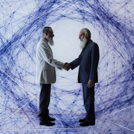Two senior businessmen shaking hands with each other, against abstract network structure