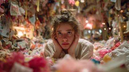 Woman resting her head on hands in a colorful, cluttered environment with lights.