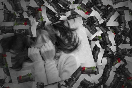 Black and white image of woman close eyes cry on fram rose picture. broken heart and conceptual.