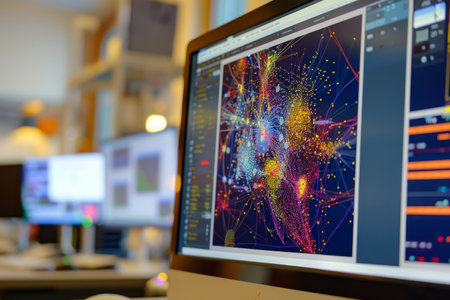 An intricate AI brain map with colorful neural networks is displayed on a computer screen, symbolizing advanced machine learning processes