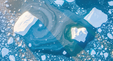 Aerial top down view of large icebergs and smaller ice floes floating in a vast expanse of blue arctic water, highlighting the pristine yet fragile polar environment.
