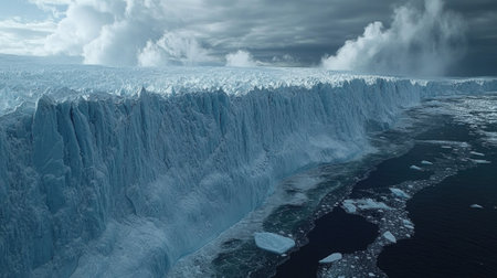A breathtaking aerial perspective showcasing the dynamic interplay between icy ocean waters and glacial formations. Explore nature's serene beauty.