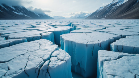 This image depicts cracked ice sheets floating on water, symbolizing the effects of global warming and climate change. The melting ice represents rising sea levels and the urgent n