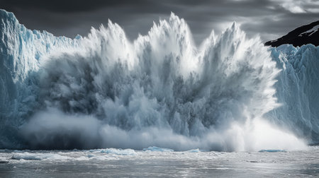 Generative AI, Glacier ice calving into the ocean, climate change concept, reminder of the fragility of Earth's ecosystems and the urgent need for climate action