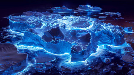 A neon-lit depiction of Antarctica, showcasing its icy terrain and unique shapes