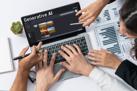 Technician and colleague use AI cognitive computing to extract information from complex data on laptop. Close up of teamworking IT experts using artificial intelligence on notebook