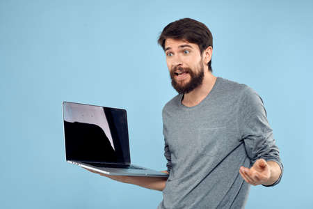 Bearded man laptop in hand internet wireless technology emotions blue background