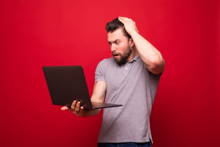 Portrait of shocked young bearded man holding hands at his head while sitting with laptop computer isolated over red background