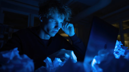 Focused programmer working late at night on laptop surrounded by crumpled papers