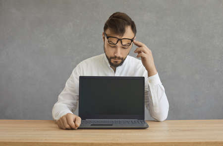 Serious man takes off glasses as he looks at empty black mockup screen of modern laptop computer. Young businessman sitting at desk in studio shows blank mock up screen of notebook PC