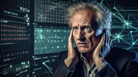 Business person overloaded by stress from business data and information that come from work, technology, social media and marketing business strategy received by a corporate employee