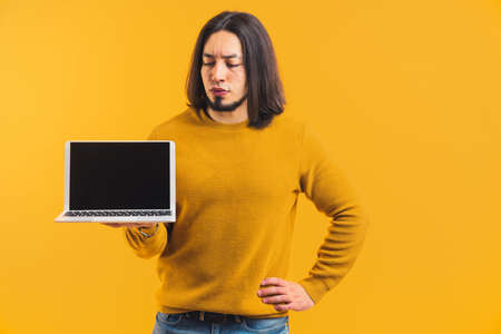 Angry caucasian bearded man with long hair looking at his laptop with mock-up black screen. Copy space studio shot over yellow background. High quality photo