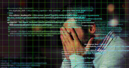 Leaning programmer studying code at office desk, with keyboard and code grid overlay, copy space. Technology, innovation, digital, productivity, focus, modern, cyber