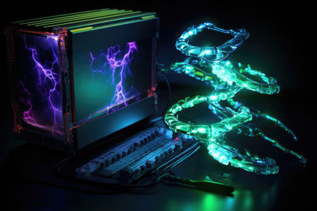 glowing dna strand next to hard drive, created with generative ai