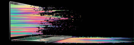 Laptop screen displays a vibrant glitch effect, revealing visual distortion as the display seems to tear apart along the margins in vivid colors.