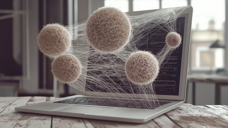 Digital composite of 3D Spheres floating over laptop screen in office