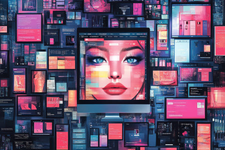 A vibrant digital composition featuring computer screen displaying stylized face, surrounded by colorful online shopping interfaces..