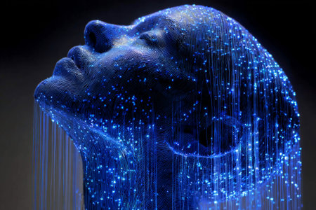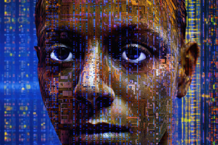 A colorful representation captures a man's face adorned with intricate digital patterns, with blue-tinted eyes reflecting technology, evoking a futuristic ambiance.