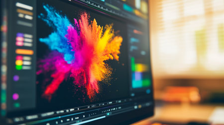 A stunning color explosion displayed on a computer monitor, showcasing vibrant hues in a creative workspace. Ideal for digital art and design themes.