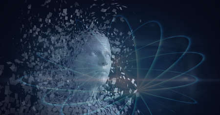 Composition of exploding human bust formed with particles over network of connections. global connections, data processing and digital interface concept digitally generated image.