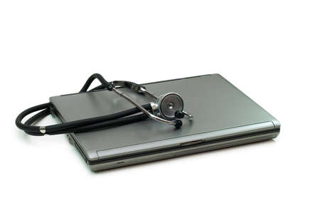Computer repair, reparation business concept. Stethoscope on the computer isolated on a white background