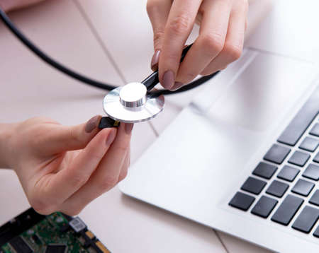 The technician applies a stethoscope to the laptop display. Problem analysis diagram. Computer repair shop concept. Mixed media