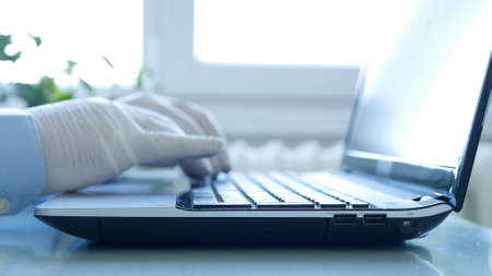 Closeup Image with Hands Wearing Protective Gloves Using the Laptop Keypad