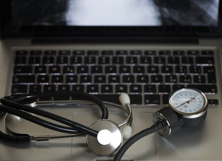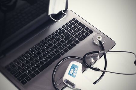 Selective focus Stethoscope on laptop keyboard - health care and medical High Dynamic Range tone concept