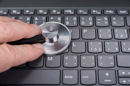 Conceptual image of the hand of a man checking the health of his laptop computer using a stethoscope as he checks for malware and viruses or any electronic malfunctions.